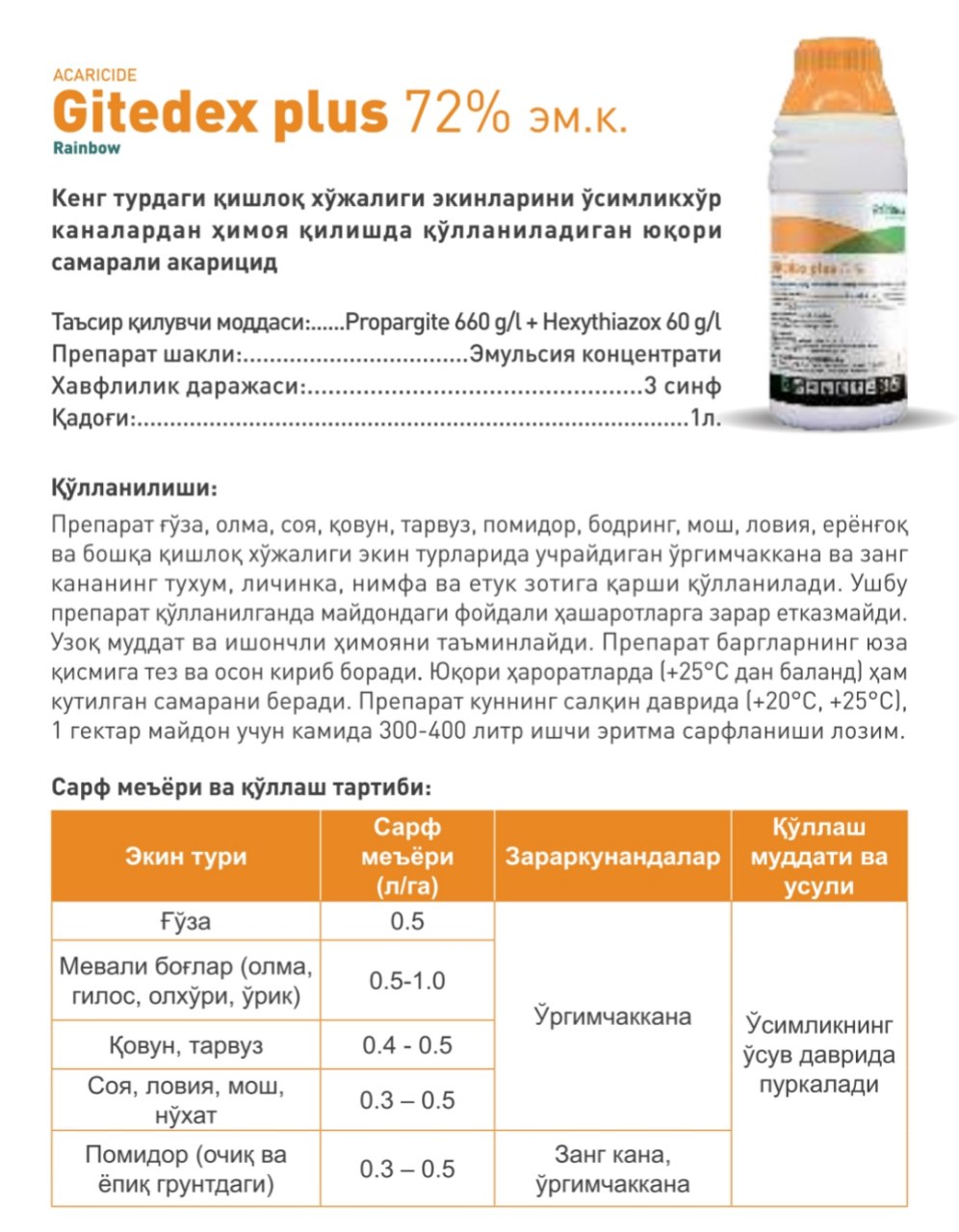 Gitedex Plus 72% – keng assortimentdagi qishloq xo’jaligi ekinlarini o’simlik bilan oziqlanadigan oqadilardan himoya qilish uchun yuqori samarali akaritsid. Bu preparat makkajo’xori, olma, soya, qovun, tarvuz, pomidor, bodring, loviya va boshqa ekinlarda uchraydigan o’rgimchak oqadilar va zang oqadilar tuxumlari, lichinkalari, nimfalari va kattalariga qarshi ishlatiladi. Gitedex Plus foydali hasharotlarga zarar yetkazmasdan uzoq muddatli himoya ta’minlaydi. Preparat yuqori haroratlarda ham samarali ta’sir ko’rsatadi va daladagi o’simliklar yuzasiga tez kiradi.