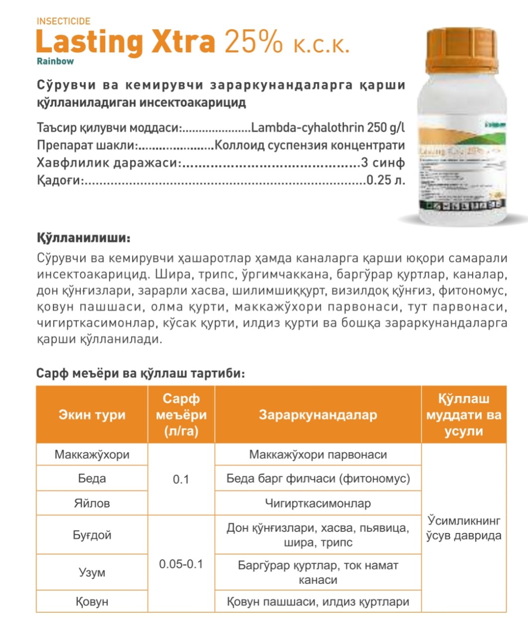 Uzluksiz Xtra, so’ruvchi va kemiruvchi hasharotlar hamda shomillarga qarshi yuqori samarali insektoakaritsid hisoblanadi. U shira, trips, o‘rgimchak oqadilar, sho‘rvalar, oqadilar, don qo‘ng‘izlari, zararli cho‘tka, shilimshiq qurt, hushtak qo‘ng‘iz, fitonomus, qovun pashshasi, olma qurti, makkajo‘xori kuya, tut kuya, chigirtka, to‘g‘ridan-to‘g‘ri qurti va ildiz qurti kabi zararkunandalarga qarshi qo‘llaniladi.